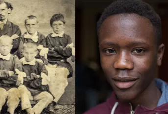 En 1866, Jean-Baptiste, 13 ans, fait partie de la deuxième promotion de jeunes de l'Oeuvre de la Première Communion, créée le 19 mars par l'abbé Roussel au 40 rue La Fontaine à Paris. En 2016, Youssouf, 15 ans, termine sa classe de troisième DP6 au lycée Sainte-Thérèse où, 150 ans plus tôt, Jean-Baptiste était accueilli. Nos vies en images. Photos : © Archives historiques et Besnard/Apprentis d'Auteuil.