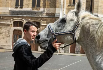 Cet après-midi, Alan, 14 ans, accompagné à la Maison d’enfants Saint-Philippe, a accueilli comme à son habitude les chevaux de Didier Le Roch, moniteur d’équitation, dans la grande cour du Prieuré. Non loin de là, un des psychologues de l’établissement, Marie Fertin Zitoli (ou parfois Marwan Hayek), supervise la séance. « Les chevaux, c’est ma passion, explique l’adolescent. Moi qui suis une pile électrique, je me calme avec eux, je deviens plus gentil et je m’amuse. » En aparté, Didier Le Roch complète les mots de l’adolescent. « Dans cette activité où l’animal est central, je pose un cadre : je rappelle aux jeunes que les chevaux ont besoin de calme pour se sentir en sécurité et venir vers eux. À eux de capter leur attention pour se faire comprendre. Ils vont ensuite les guider sur un petit parcours d’obstacles, les monter seuls ou en binôme et travailler l’entraide. Le plus souvent, cela se passe très bien entre le jeune et l’animal. »