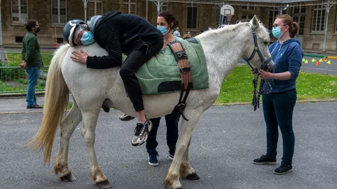 Les ateliers d’équithérapie ont été lancés en 2017 par une des psychologues du village éducatif, qui souhaitait donner aux jeunes la possibilité d’exprimer une émotion, un ressenti, d’une façon beaucoup plus ludique que dans des rendez-vous formels. « Lors de ces séances, les jeunes n’ont pas l’impression d’être en entretien avec un psychologue, souligne Marie Fertin Zitoli. Alors qu’ils livrent beaucoup d’eux-mêmes dans leurs interactions avec l’animal, que ce soit par leurs mots de tendresse - « tu peux rester avec moi » - ou de reproche - « tu n’es qu’un bon à rien ». Le cheval devient le miroir de leur âme, les relie aux êtres humains et les ouvre au monde. » Des moments qui se transforment en leçons de vie. La psychologue se souvient notamment d’un atelier où Alan ne parvenait pas à placer un licol sur la tête du cheval. « Tout en le valorisant, je lui ai fait comprendre qu’à deux nous pouvions réussir. Qu’il pouvait demander de l’aide à un adulte. » Avec le cheval, ces jeunes volontaires, âgés de 11 à 21 ans, découvrent la subtilité de la communication non verbale. Par un geste de la longe, ils doivent rassurer, s’affirmer, se faire comprendre. Sur le cheval, ils dominent leur peur, s’autorisent à lâcher prise et à prodiguer des caresses. « Lorsque j’ai découvert les chevaux, j’ai eu très peur, confie Saidouba, jeune mineur non accompagné. Puis j’ai réussi à monter et à faire des activités. Je suis fier de moi ! »