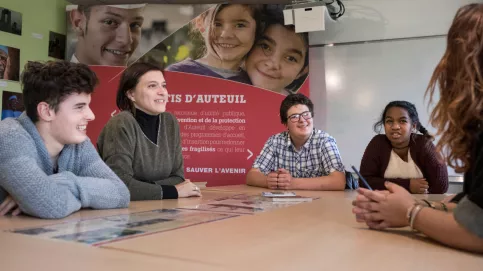 Quelques jeunes de la Maison d'enfants réunis autour de Marie Diop, éducatrice sur le thème du devoir de mémoire. Photo : Besnard/Apprentis d'Auteuil