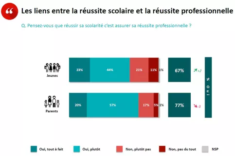 L’école, quant à elle, garde la cote : 72% des jeunes et 68% des parents font globalement confiance au système éducatif pour assurer à tous l’acquisition des savoirs de base. Ces chiffres élevés marquent toutefois une baisse par rapport au précédent baromètre qui, à la faveur du confinement de mars 2020 et d’un « effet Samuel Paty », avait mis en lumière l’importance de l’école, pour les jeunes et leurs familles. Un retour à la normale, donc, qui ne doit cependant pas cacher une érosion de la confiance des jeunes dans la capacité de l’école à leur permettre de réussir professionnellement. Du côté des parents, ils ne sont que 51% (en retrait de 7 points par rapport à 2020), à penser que l’école puisse être un lieu d’épanouissement pour leurs enfants.