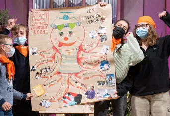 Tout aussi concernée, Salomé, 16 ans, de la Maison d’enfants Saint-Joseph à Blanquefort (33), souligne la nécessité pour chaque jeune de connaître ses droits. « C’est à l’école primaire que l’on devrait apprendre les droits qui nous protègent. Droit d’avoir une famille, d’être soigné, de manger sainement, d’aller à l’école, de s’exprimer et d’être protégé de la violence et de l’exploitation. Tout enfant riche ou pauvre devrait pouvoir être protégé par une personne qu’il connaît ou pas. Car un enfant n’est pas toujours bien traité à la maison, à l’école, dans la société. Cette personne devrait petit à petit lui apprendre ses droits et ses devoirs, les plus simples au début, pour qu’il comprenne tout au fur et à mesure. L’essentiel est que chaque enfant soit heureux. »À la fin du pèlerinage, les jeunes ont écrit et dessiné les droits de l’enfant essentiels à leurs yeux sur une grande fresque colorée. Comme un SOS à l’assemblée, comme un écho au message que Gilian avait transmis durant l’atelier : « Janusz Korczak, un médecin polonais, a dit il y a très longtemps : Les souffrances des petits ne sont pas des petites souffrances. Alors, aidons-les, écoutons-les ».