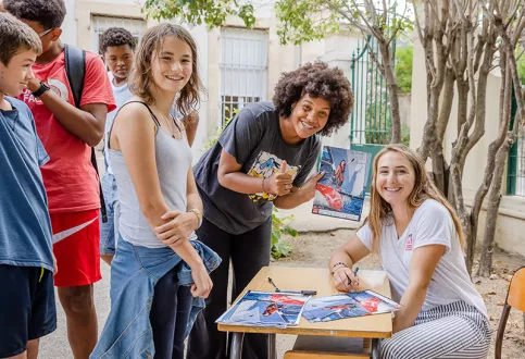 « On a regardé toutes les photos et les vidéos que Violette poste sur YouTube, Instagram et TikTok », s’enthousiasme Badis, 14 ans, heureux de « la voir en vrai ». « Est-ce que c’est ton métier ? », demande un de ses camarades. « Je suis encore étudiante. Mon rêve, c’est de vivre de la voile. Mais obtenir un diplôme me permettra d’avoir un métier si jamais je décidais d’arrêter ou s’il m’arrivait un accident. » Dans la cour, une séance de dédicace de photo s’improvise dans une joyeuse effervescence. Angela, en cinquième, jubile : « Je suis trop contente. Je vais montrer la photo à ma mère ce soir. »