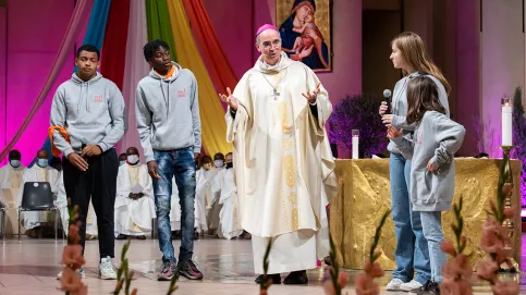 Invités à témoigner devant l’assemblée réunie, Noëlie, 11 ans, et Lassana, 17 ans, du Mans communiquent leur bonheur d’être là. « Je n’avais jamais fait de pèlerinage, prévient Noëlie. Je voulais découvrir ce que c’était et prier pour mon grand-père décédé en 2017. Profitons, tous ensemble, de la chance que nous avons d’être là. »