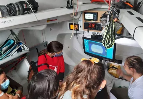 Le 19 septembre, jour de l'arrivée, Violette nous attendait, le directeur adjoint, deux éducatrices, Léa, Jennifer, Mélissa et moi. Elle nous a fait visiter son bateau baptisé DeVenir. Nous étions très fiers de voir le logo Apprentis d’Auteuil flotter sur sa grand-voile ! Violette nous a tout expliqué de la course, des étapes, de la navigation de jour et de nuit, des algues qui peuvent être très dangereuses. Elle nous a fait découvrir son monde.